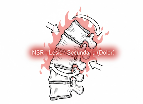 Para compensar la rigidez primaria, el cuerpo genera una o varias adaptaciones o lesiones secundarias, que se organizan en patrones de grupo según la Primera Ley (NSR). Estas zonas compensatorias se vuelven hipermóviles y, por lo tanto, se sobrecargan. Es esta sobrecarga hipermóvil la que produce la inflamación y, finalmente, el dolor.